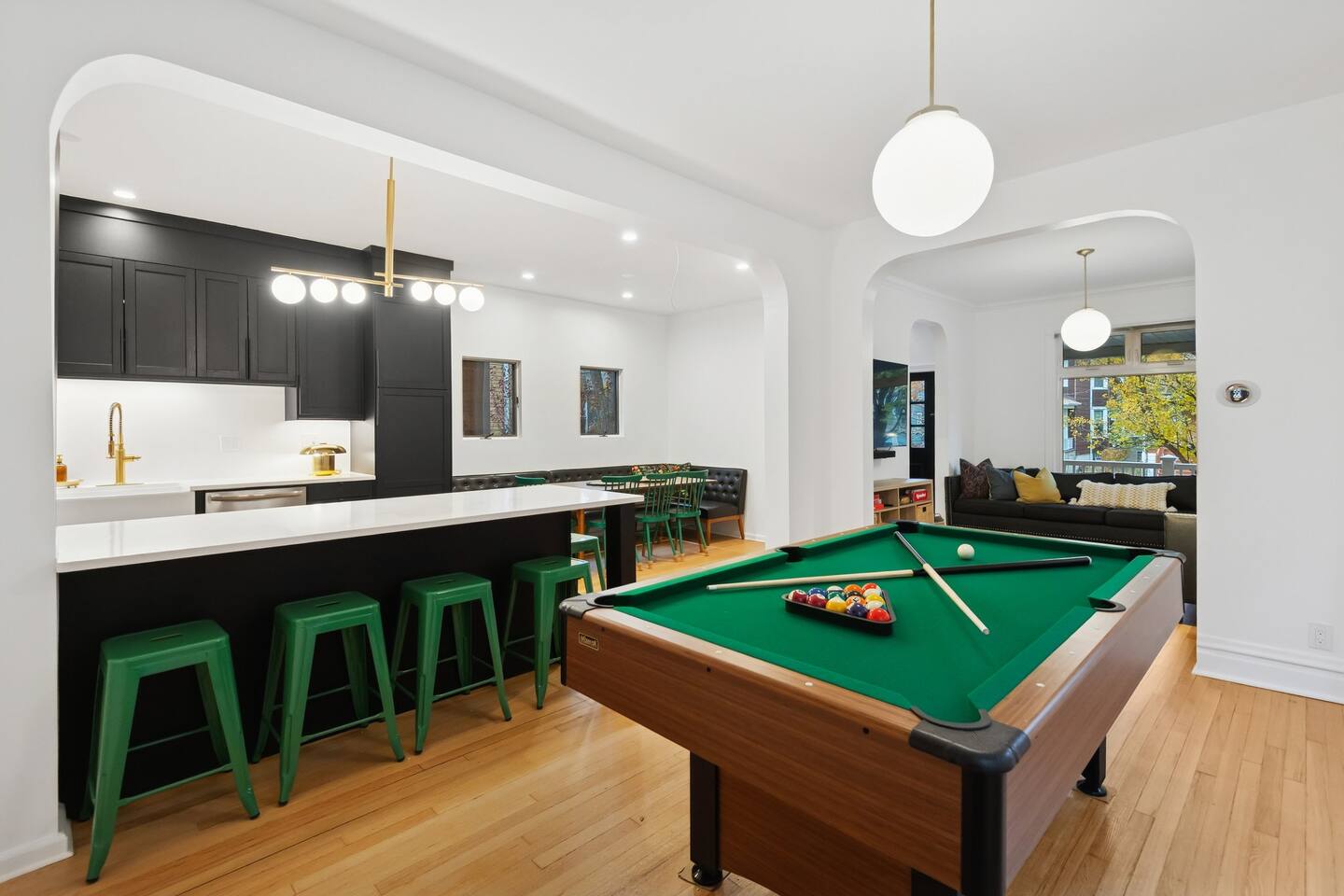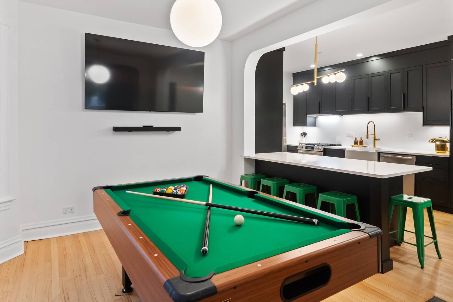 Bring the whole crew to this spacious Irving Park home packed w/fun! Shoot pool, kick back with smart TVs in almost every room, spread out in the huge living/dining areas, and cook up a storm in the fully-equipped kitchen. Sleeps comfortably with multiple bedrooms and bathrooms. Just 15–25 min Uber to Wrigley Field, Downtown, The Bean, Soldier Field, United Center, Salt Shed, Riverwalk, and more. Perfect for families, friend groups, Cubs trips, concert weekends, or a relaxed Chicago home base!