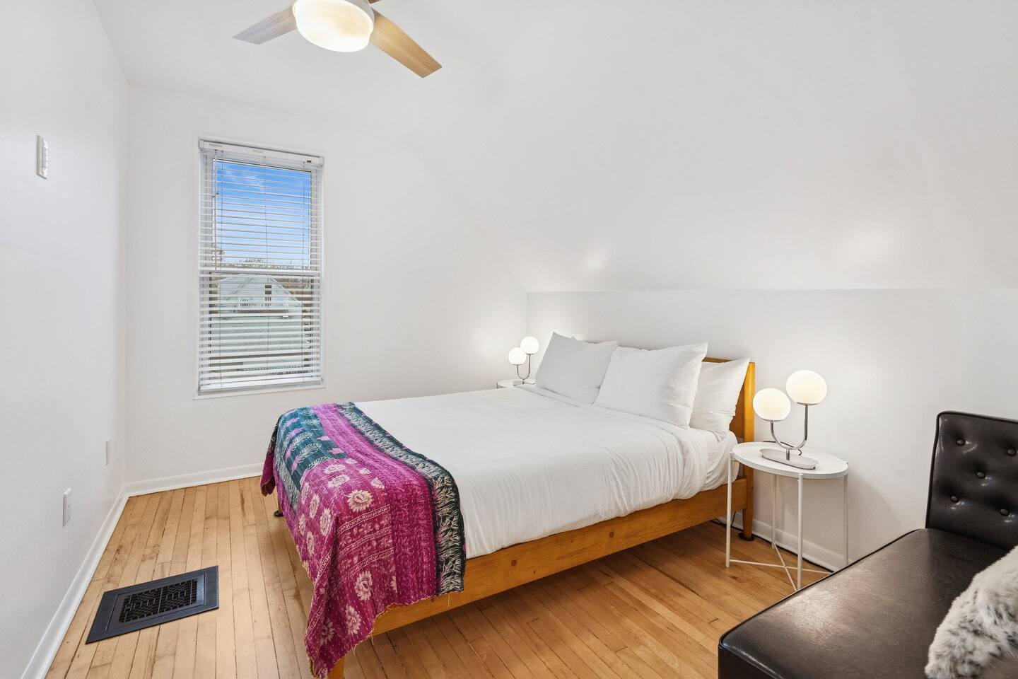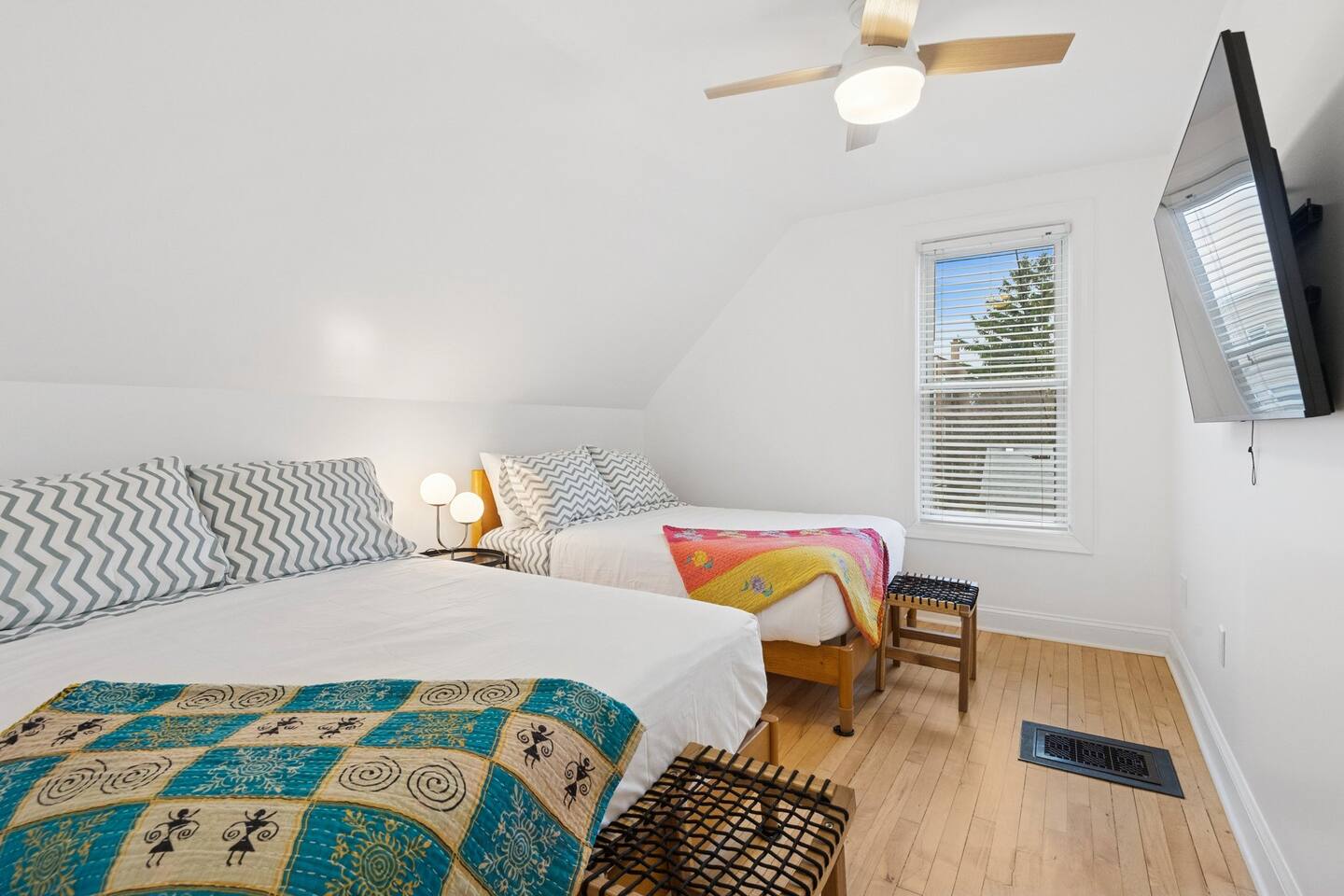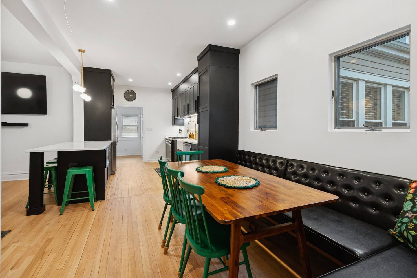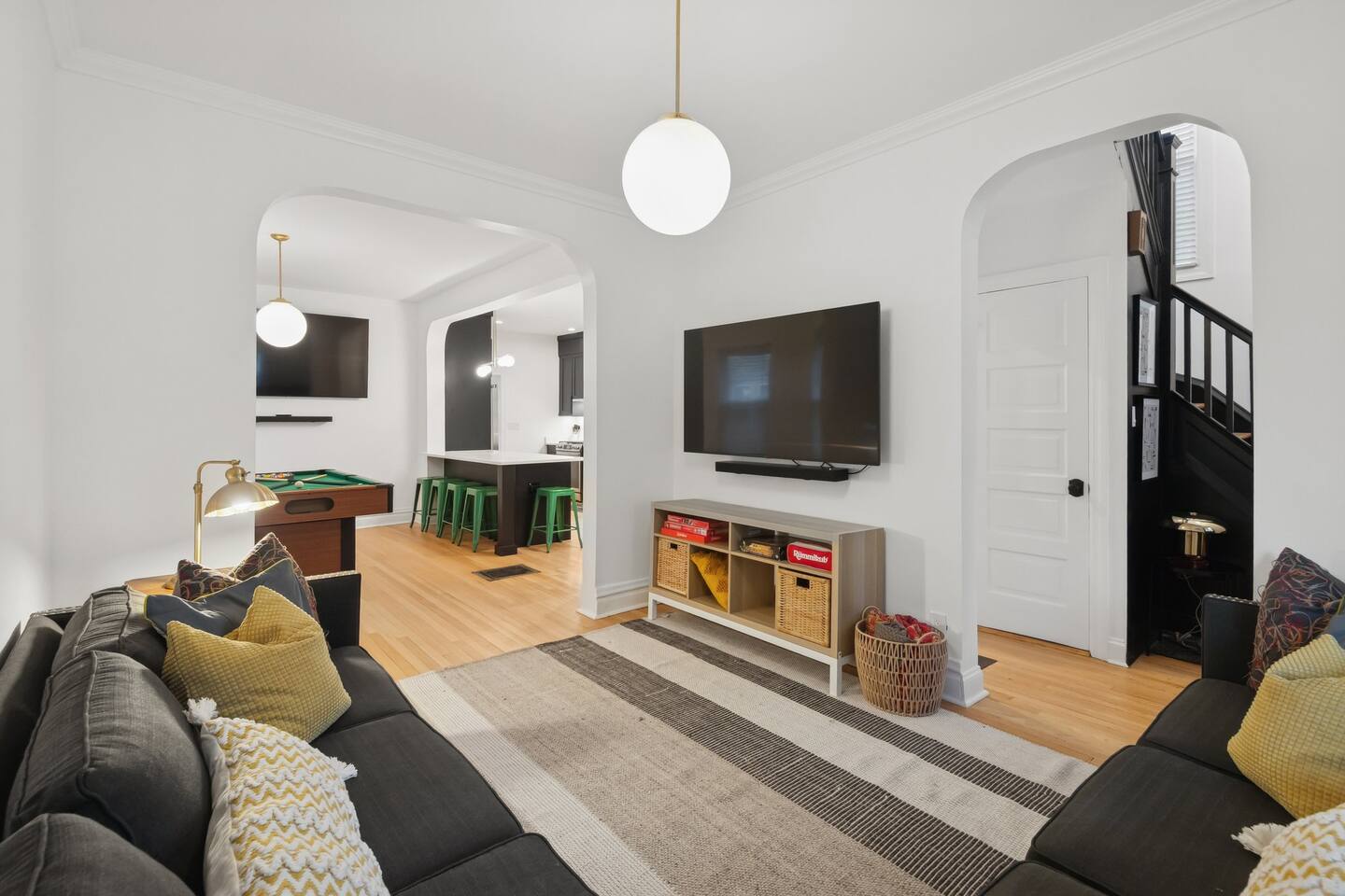 Classic early-1900s Chicago Craftsman Foursquare loaded with vintage charm, beautifully preserved with iconic Chicago front porch. STEP INSIDE THIS CLASSIC CHICAGO HOME AND FEEL THE FLOW Living Room As you enter the cozy foyer, the staircase to the second floor is on your right. To your left, you’ll find the bright “frunchroom” (Chicago speak for living room) with an oversized L-shaped sectional, 65” Fire TV & soundbar – perfect for movie nights. Kitchen & Dining Area Straight ahead is the dining area with a large leather banquet and table – ideal for family meals, morning coffee, or getting some work done. The dining area seamlessly flows into the chef’s kitchen, fully equipped with everything you need to cook for a crowd (holiday feasts, game-day spreads, you name it). An 8-foot peninsula doubles as extra prep space or a casual snack bar (with power at either ends of the peninsula). Coffee Bar The kitchen is fully equipped to cater to all your coffee and tea needs! You’ll find a 12-cup drip coffee maker, a Keurig single-serve coffee maker, a French Press, and even a coffee bean grinder for freshly ground coffee. To make things easier for you, we’ve stocked the coffee station with Keurig pods, packets of sugar and Splenda, as well as Nestlé Coffee Mate creamer singles. For tea lovers, there’s an electric tea kettle available for use, perfect for brewing tea or preparing other hot beverages. Game Room On the other side of the peninsula is the game room: Bar box pool table, 75” smart TV & soundbar, and plenty of space to watch the game, shoot pool, or just hang out. The open layout keeps everyone connected while still giving distinct zones for relaxing, dining, and playing. It’s the perfect mix of vintage Chicago charm and modern hangout vibes! YOUR SLEEP & COMFORT IS OUR PRIORITY The home has five private bedrooms with luxury hotel-quality bedding: -100% organic cotton sheets -Allergen-free duvets (cool in summer, warm in winter) -Pillow mix for side, back & stomach sleepers -Room darkening blinds in every bedroom -Bedside charging outlets/USB SECOND FLOOR (3 bedrooms + large full bathroom) Bright shared bath with plenty of natural light Hooks lining the hallway & inside every walk-in closet – great for towels, hoodies, robes -Bedroom 1: King bed, two nightstands, walk-in closet, ceiling fan, two mid-century chairs for a private retreat -Bedroom 2: Two full-size beds, one nightstand, ceiling fan, two small benches, 55” Fire TV, huge walk-in closet, full-length mirror -Bedroom 3: Queen bed, two nightstands, ceiling fan, large walk-in closet off hallway, leather chaise FIRST FLOOR bedroom suite (1 bedroom + full bathroom) Bedroom 4 is located just off the kitchen Private bathroom with walk-in shower, high toilet & support bar Hooks lining the wall Bedroom 4: -Full-over-full bunk bed supports 1,000 lbs of distributed weight, plenty of headroom on bottom, sturdy 18" wide stairs lead to top bunk which has 30" headroom, -Walk-in closet, 55” Fire TV, desk/table, backyard views, room darkening blinds BASEMENT (1 bedroom + full bathroom) Private bath with walk-in shower Full-size washer & dryer right outside the bedroom Bedroom 5: -Two twin beds -40” TV with two comfy bean bags, wall tic-tac-toe and checkers -Fun cotton-canvas tent playhouse (kids love it!) Sleep well wherever you land! HI-TECH & HASSLE-FREE HOME Stay connected and comfortable with smart tech throughout: -Blazing-fast Wi-Fi powered by enterprise-grade Unifi access points on every level – perfect for streaming, work calls, or group FaceTimes -Nest thermostat (located in 1st floor game room) monitors the temperature on each floor -Keyless entry via Schlage smart lock – your own unique code sent before check-in (no keys to lose!) -All TVs hardwired with Cat6 + smart soundbars (Bluetooth-ready for Spotify, Apple Music, etc.) -Exterior security cameras for peace of mind Play hard, stream harder, relax completely – the tech just works.